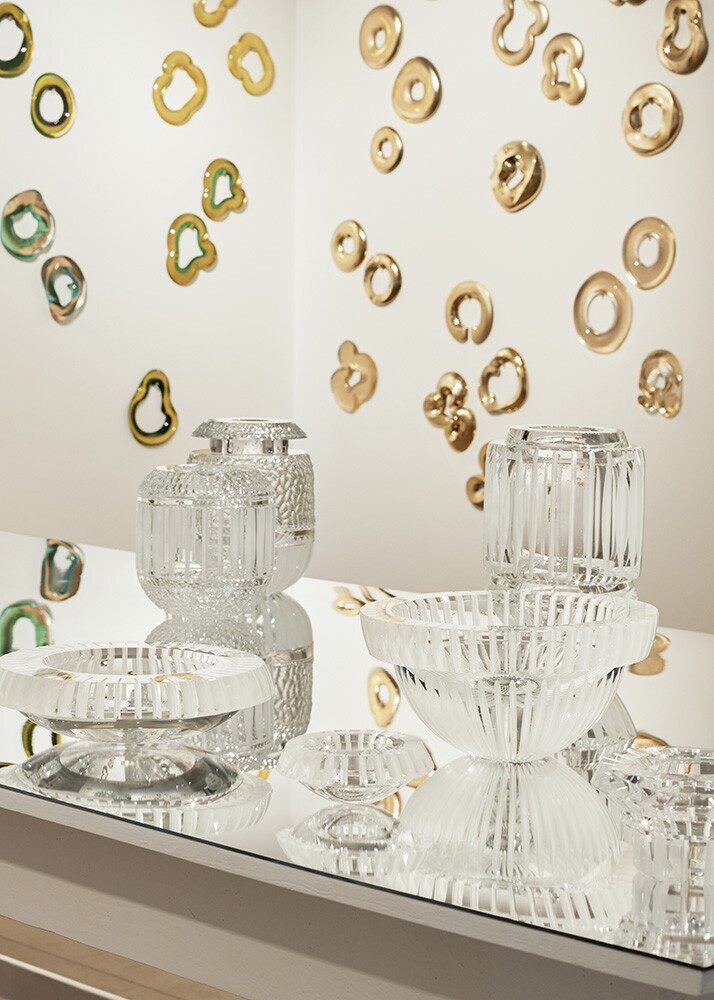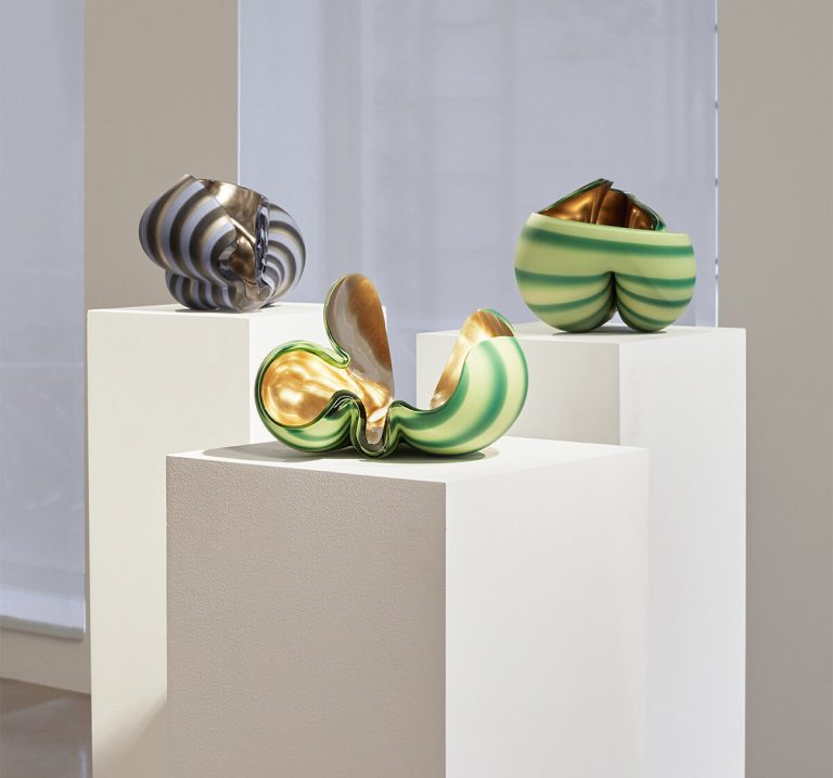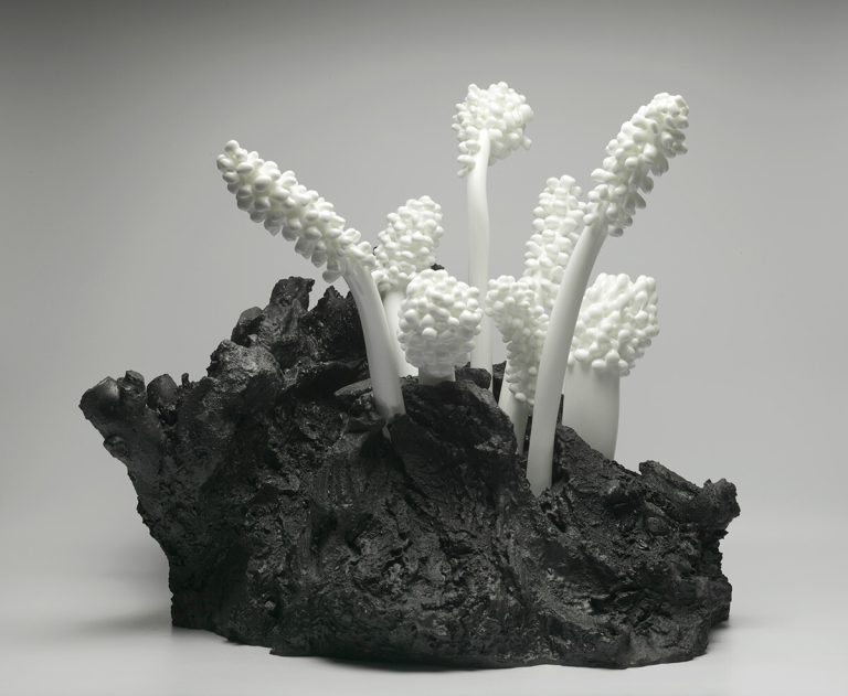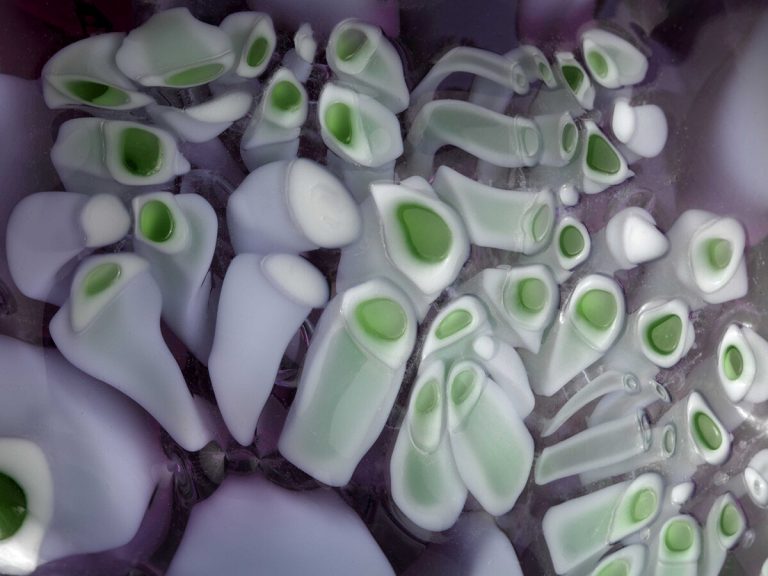 She studies crystals, jellyfish, flowers and micro-organisms with a particular fascination with form, structure and geometry. Her work arises in species and families as is fitting from the natural world which inspires them. In 2009 she began working on the Eternal Spring collection, an installation with objects made of milky white opal glass depicting the awakening nature in spring. The installation includes snow-white branches that protrude from walls, tables and floor objects, from knots of willows or from corals. Some of these objects, including those created with the cast of an ancient pollard willow, are monumental in scale.